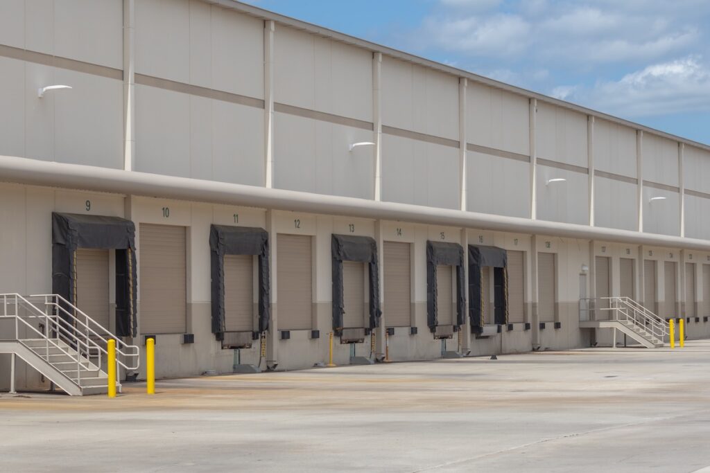 Wide angle view large industrial warehouse with multiple doors for trucks loading and unloading dock
